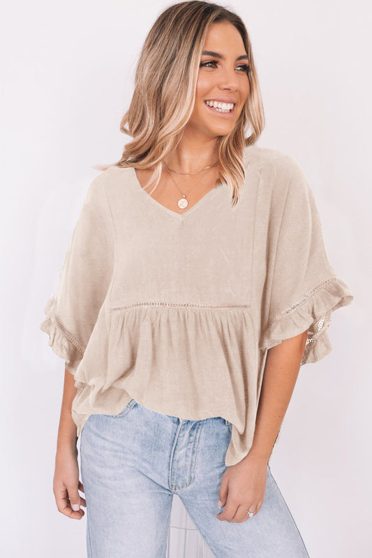 Apricot Ruffled Lace Detail Loose V-Neck Top